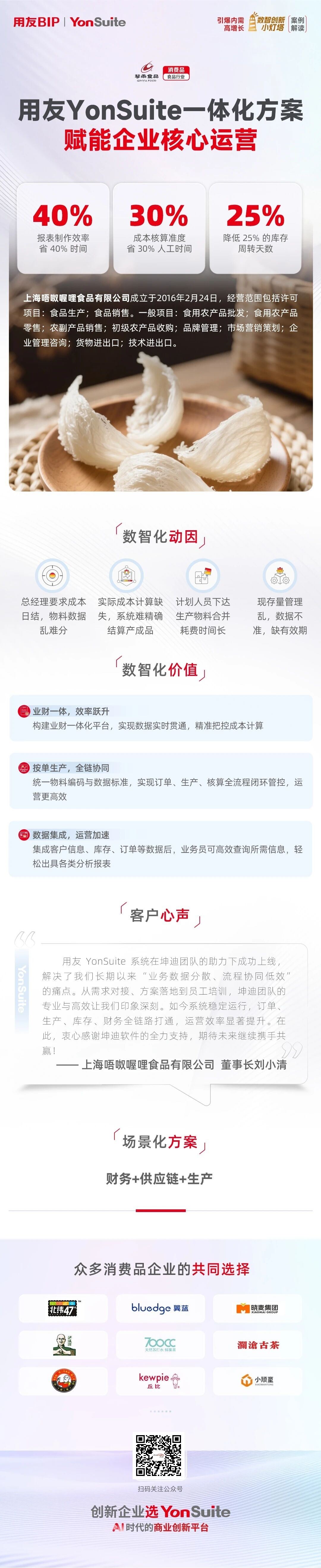 “用友 YonSuite 系统在团队的助力下成功上线,解决了我们长期以来‘业务数据分散、流程协同低效’的痛点。从需求对接、方案落地到员工培训,团队的专业与效率让我们印象深刻。如今系统稳定运行,订单、生产、库存、财务全链路打通,运营效率显著提升。在此,衷心感谢用友软件的全力支持,期待未来继续携手共赢!”上海唔呶喔哩食品有限公司董事长刘小清的这番话语,不仅是对用友 YonSuite 数智化价值与团队服务的高度认可,更彰显了上海唔呶喔哩食品主动拥抱变革、追求高质量发展的坚定决心。通过此次数智化转型,企业不仅解决了成本、物料、库存的传统难题,更构建了数据驱动的运营体系,为业务拓展与市场竞争筑牢了数字底座。