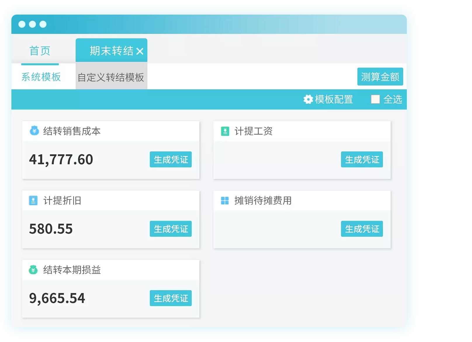 自动生成损益凭证、成本结转凭证、计提折旧凭证,期末结转再也不会出错;