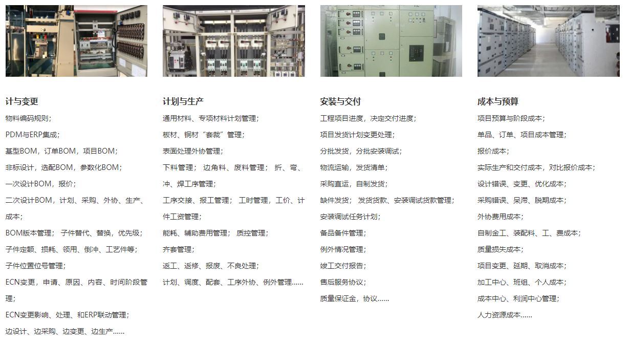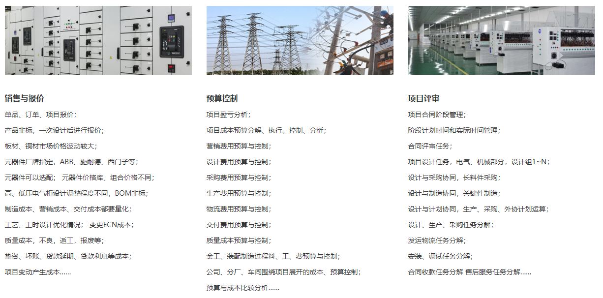 · 管理难点:元件厂牌选择,BOM选配,成套电气管理,WBS任务分解,项目报价,货款回收,项目进度,设计制造协同,ECN变更,项目预算与成本等。