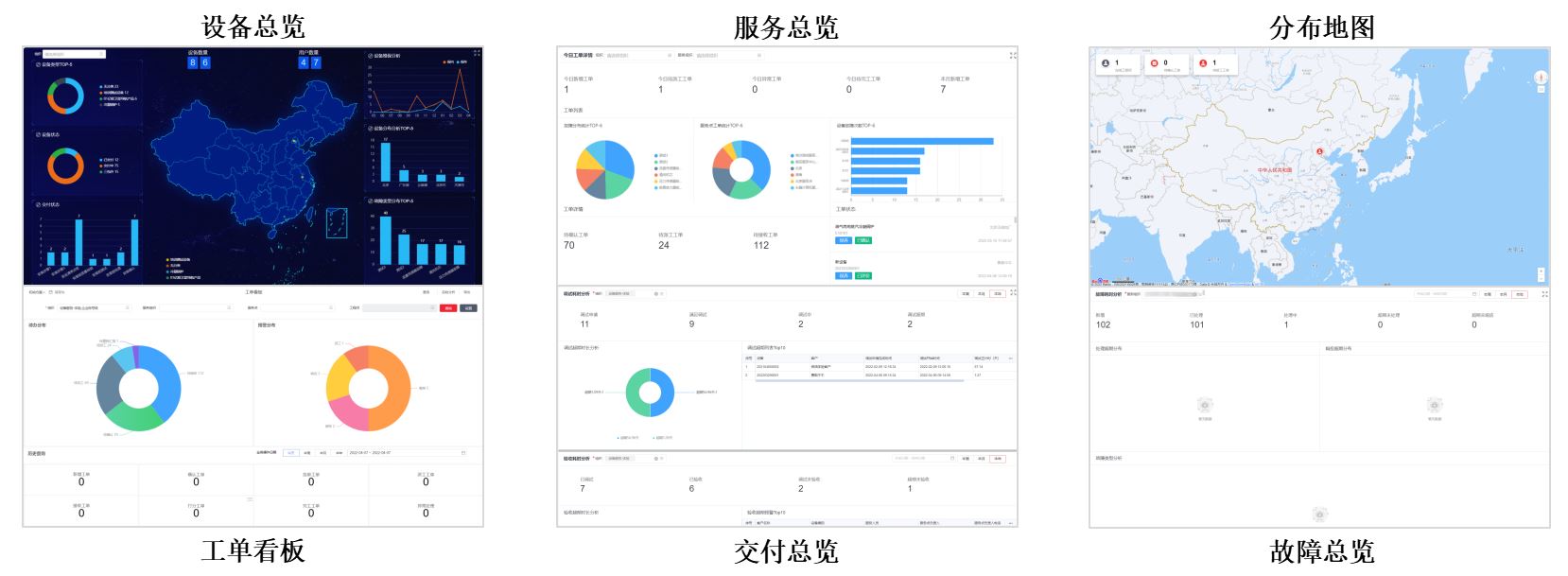 设备后服务提供了丰富的查询看板,服务数据可视化,服务过程进行实时监控,及时决策、及时执行。可查询的内容包括但不限于【工单看板】、【工单查询】、【分布地图】、【服务总览】、【故障总览】、【设备总览】、【设备履历】等等。