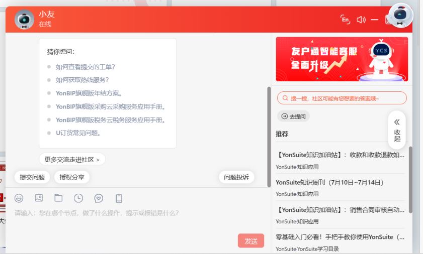 2.用友yonsuite 产品,登录yonsuite界面,右上角选择云客服,点击转人工客服,可进行在线咨询问题。