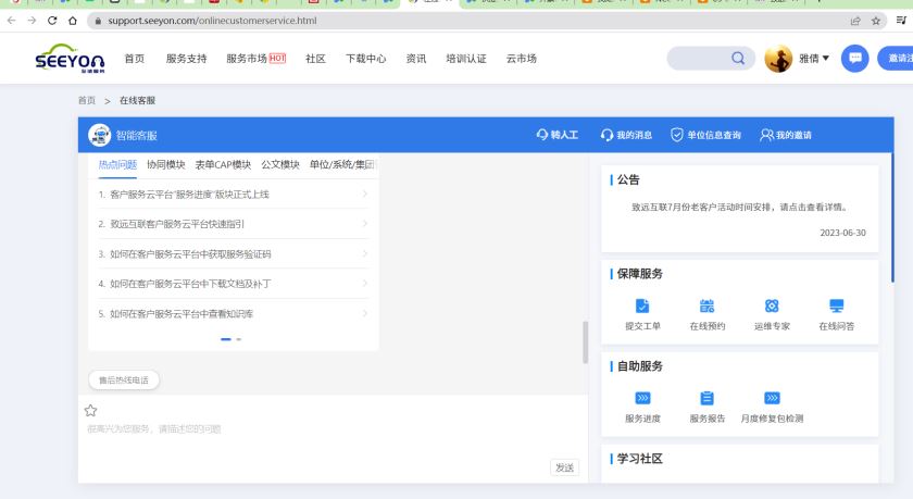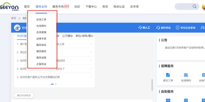 4.致远互联自助服务:用户登录 (seeyon.com),客户登录注册账户-企业认证-完善信息-选择服务支持--可在线工单/在线预约/在线客服/运维专家--提交问题