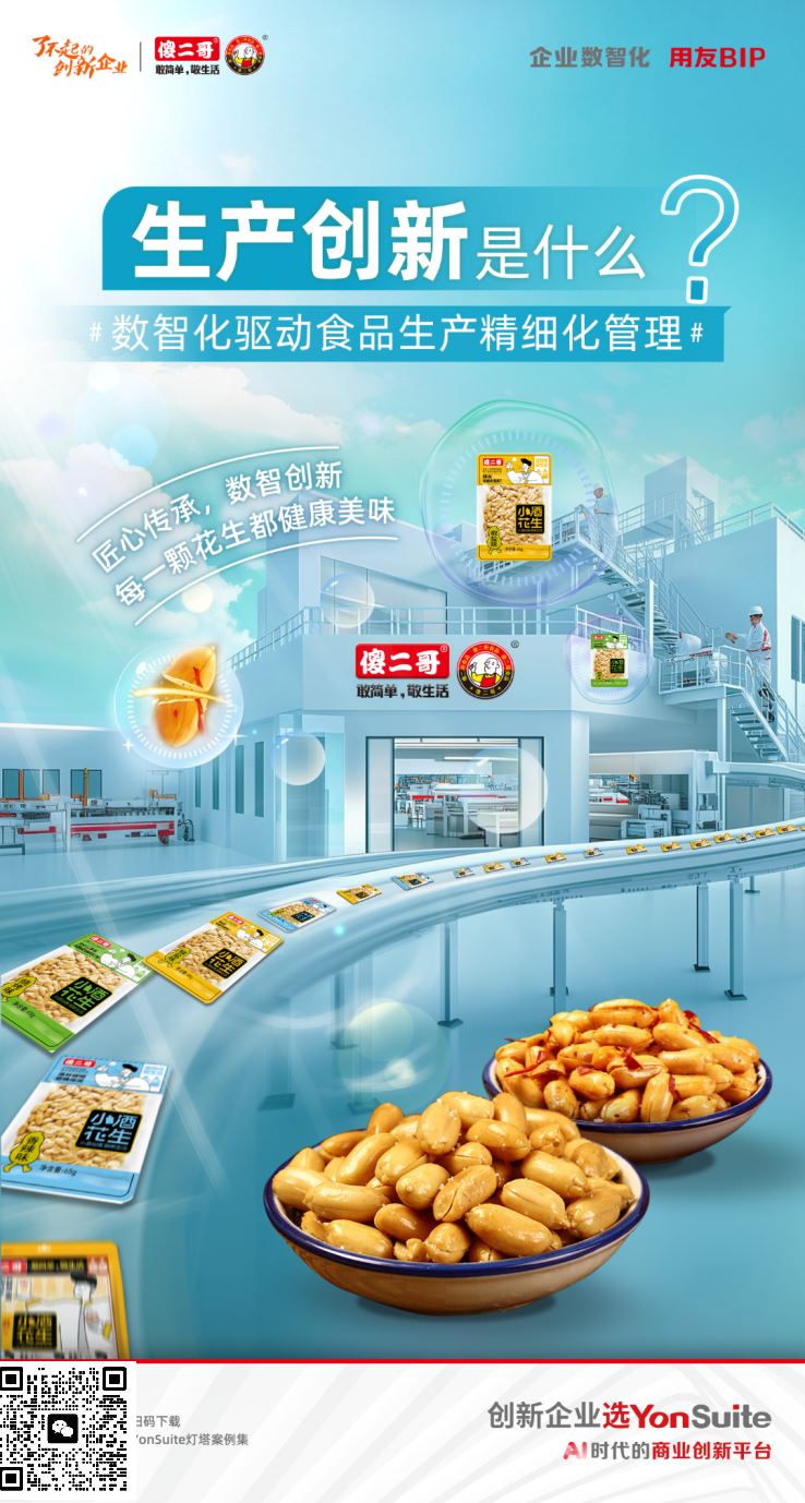 以国内知名的休闲食品企业傻二哥食品为例,其在发展过程中,通过拥抱数智化,成功实现了从传统食品制造向“智造”先锋的蜕变。通过YonSuite,傻二哥食品不仅优化了全渠道的营销和管理,实现了对经销商网络和消费者画像的准确分析,为“小酒花生”等爆品的成功孵化提供了数据支撑。