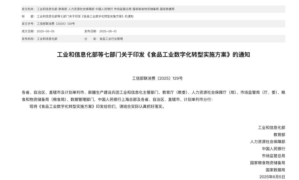 6月10日,工业和信息化部等七部门联合印发《食品工业数字化转型实施方案》(以下简称《方案》),部署了“四大行动”和“十八项具体措施”,旨在加快推动数字技术全角度赋能食品工业发展,吹响了食品工业迈向数智化新时代的号角。