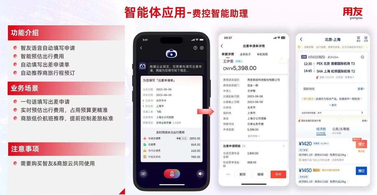 可以直接通过“智友”发起商旅申请,“智能商旅助理“即可根据出行政策、预算标准、个人偏好等,智能推荐较优行程方案,并自动完成机票、酒店预订。差旅结束后,将自动审核差旅费用是否符合企业政策,根据合规结果和预算自动完成审批,全流程智能化、无纸化,真正实现“说走就走,无需后顾之忧”的智能商旅体验。