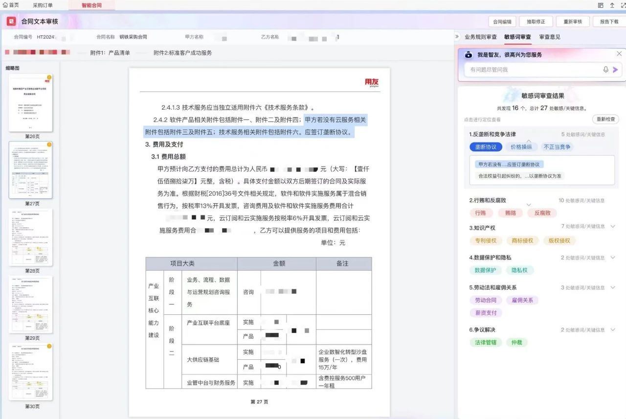 YonSuite AI赋能财务领域,实现发票智能识别、报销智能审批、风险智能预警、报表智能生成等功能。多智能体协同运作,构建起智能财务运营体系,例如数智合同助理,通过合同智能审核智能体实时发现问题并给出修改建议。