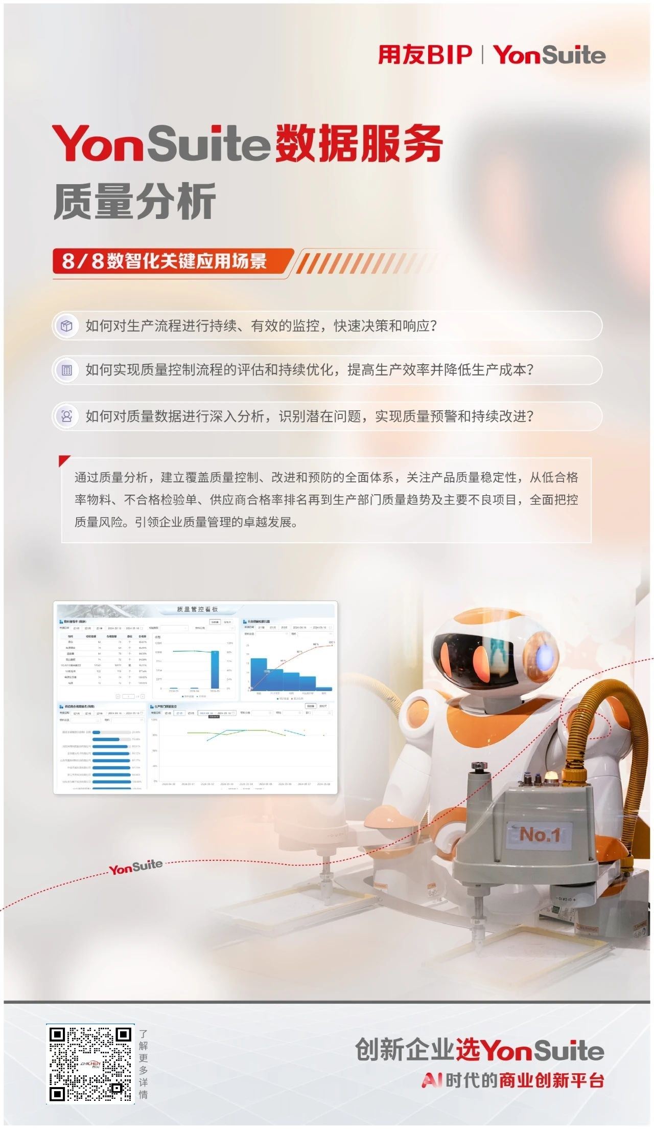 在快节奏的生产环境中,质量是企业赢得市场的关键。YonSuite预置质量主题分析,建立覆盖质量控制、改进和预防的全角度体系,关注产品质量稳定性,全角度把控质量风险,驱动质量持续改进。