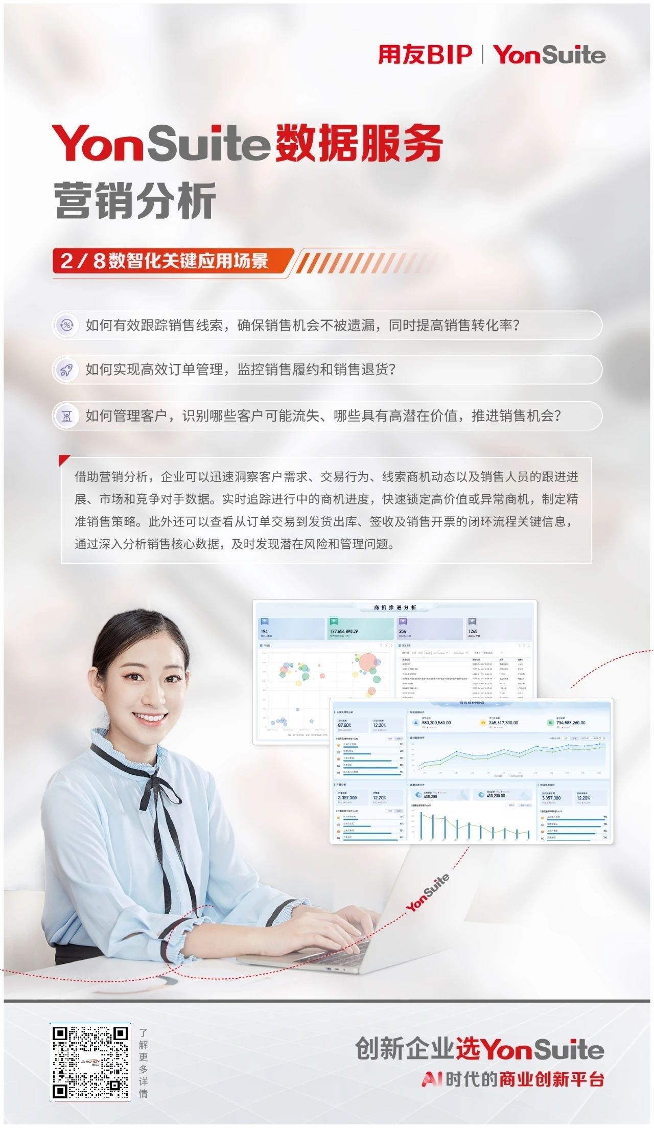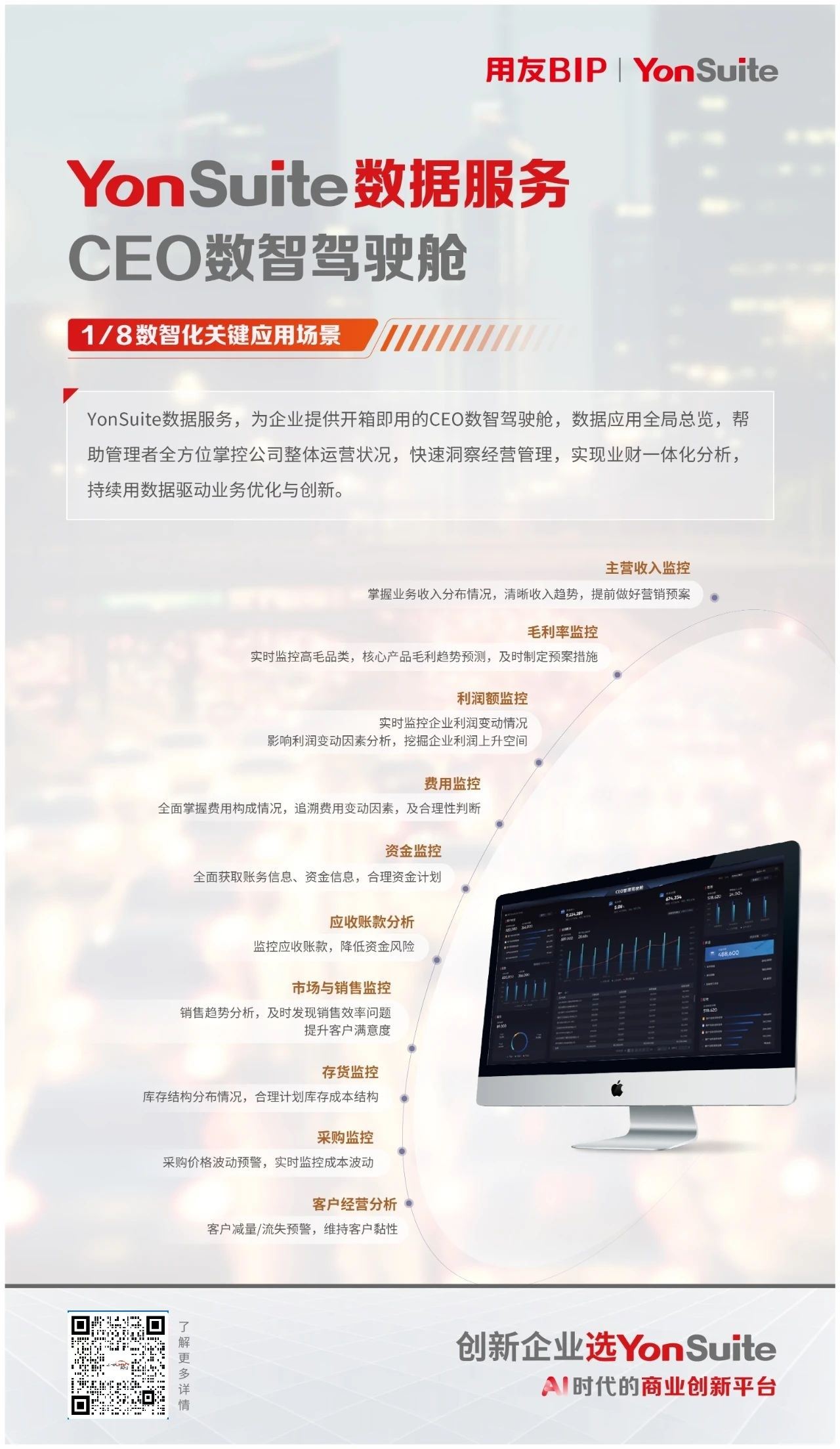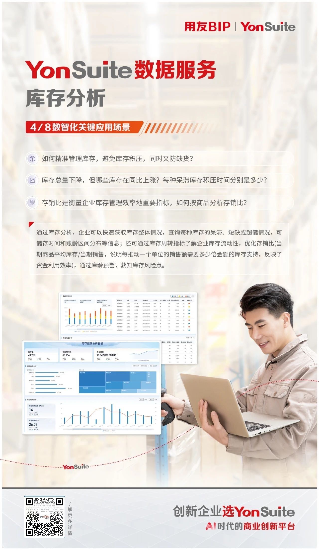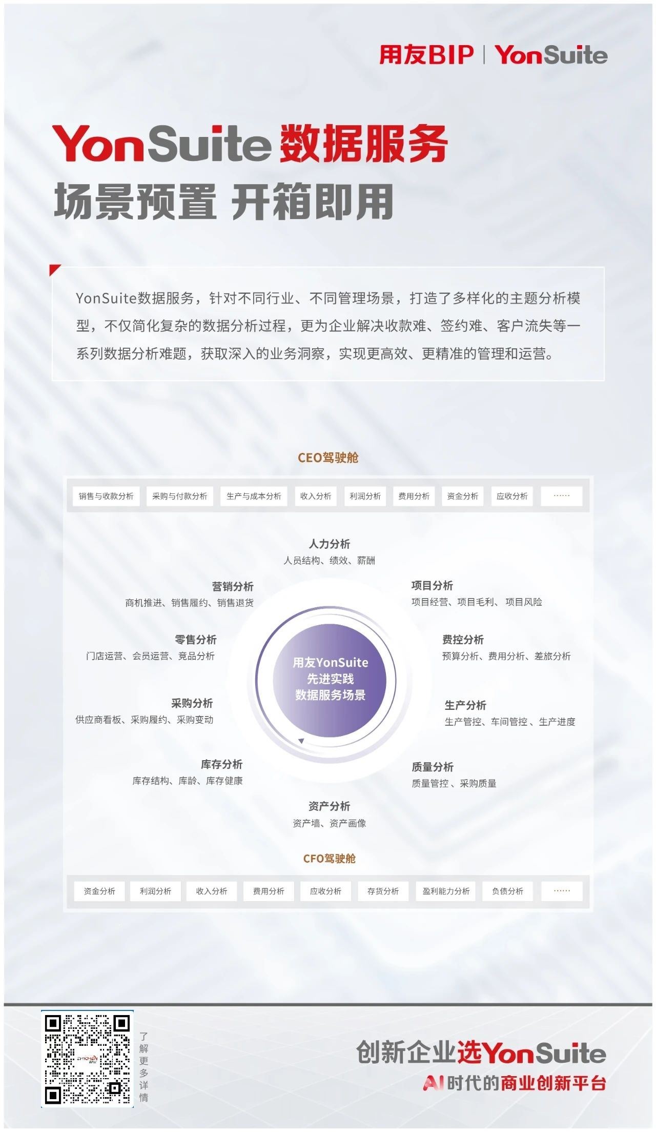 作为AI时代的商业创新平台,YonSuite以其强大的数据分析能力,为企业提供全角度的数据服务支持。凭借先进的数智技术和强大的数据资源与场景模型,提供数据集成、数据治理、数据分析、数据应用、社会化数据等一站式数据服务,助力企业释放数据潜力,提升运营效率、准确控制风险,打造业务自动化、准确决策的新一代智能企业。