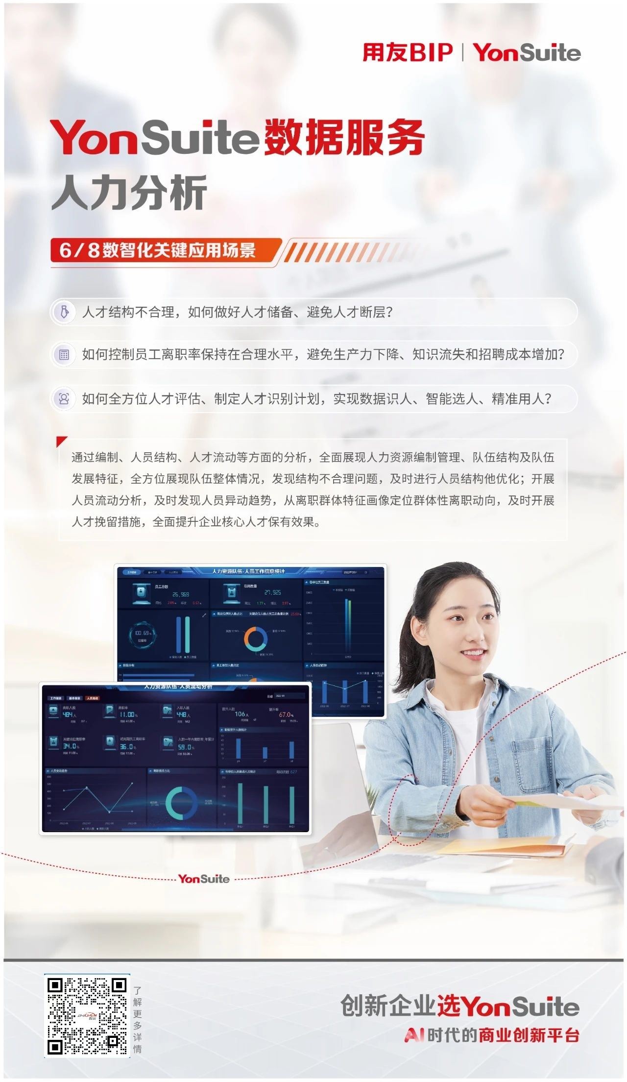 人才是企业生存发展的基石。YonSuite预置人力主题分析,助力企业构建数字人力,准确剖析人才结构,深度洞察离职率趋势,全角度人才评估,有效提升人才效率,为企业战略发展提供坚人才支撑与决策依据。