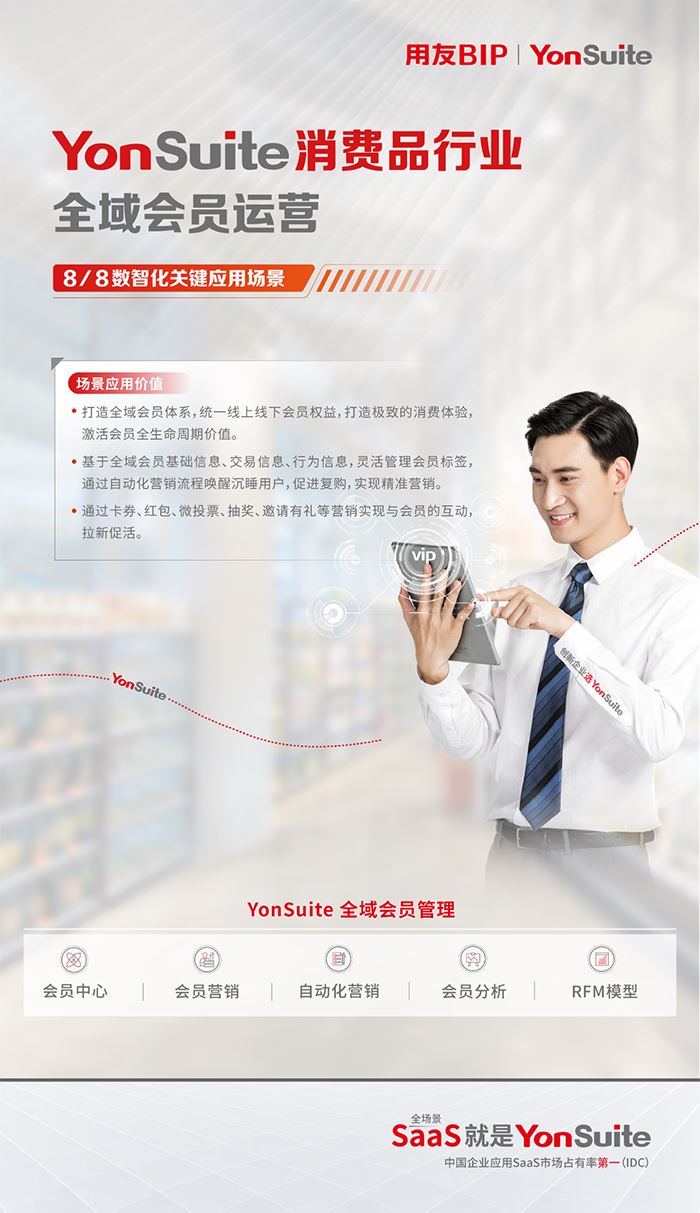 全域会员运营在提升流量转化、增强品牌与消费者关系以及提升品牌竞争力等方面都具有显著的价值。YonSuite支持企业构建全域会员体系,统一线上线下会员权益,打造随时购、随时退的极致用户体验,有助于激活会员全生命周期价值;支持灵活的会员标签管理,通过自动化营销流程有效唤醒沉睡用户并促进复购;会员中心的互动性营销助手有效地拉新和促活,是提升会员粘性和激活会员价值。