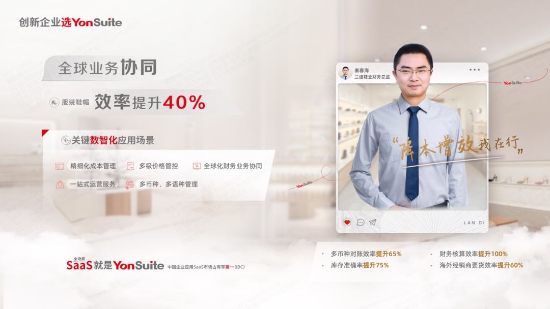 比如,遍布东非十余的东非鞋王兰迪鞋业,通过YonSuite平台按需组建了属于自己的数智化经营飞轮(包括多币种对账统一管理、业务流程线上化、销售仓储实时联动、价格管控等实际业务需求场景)。