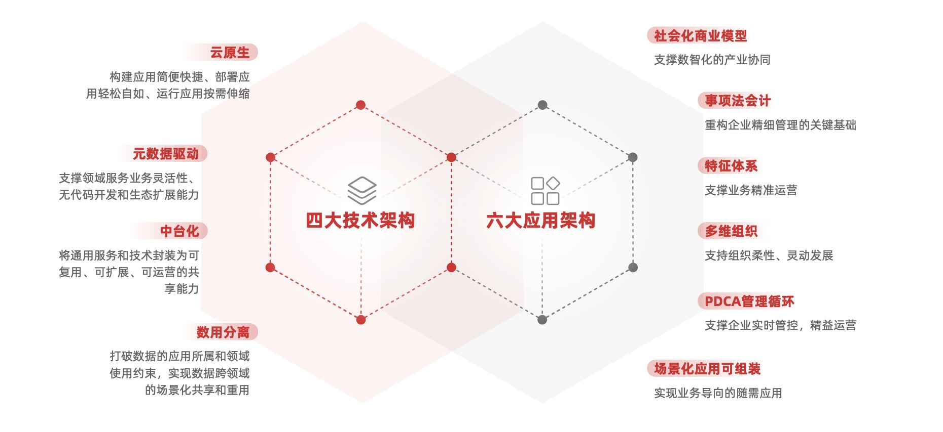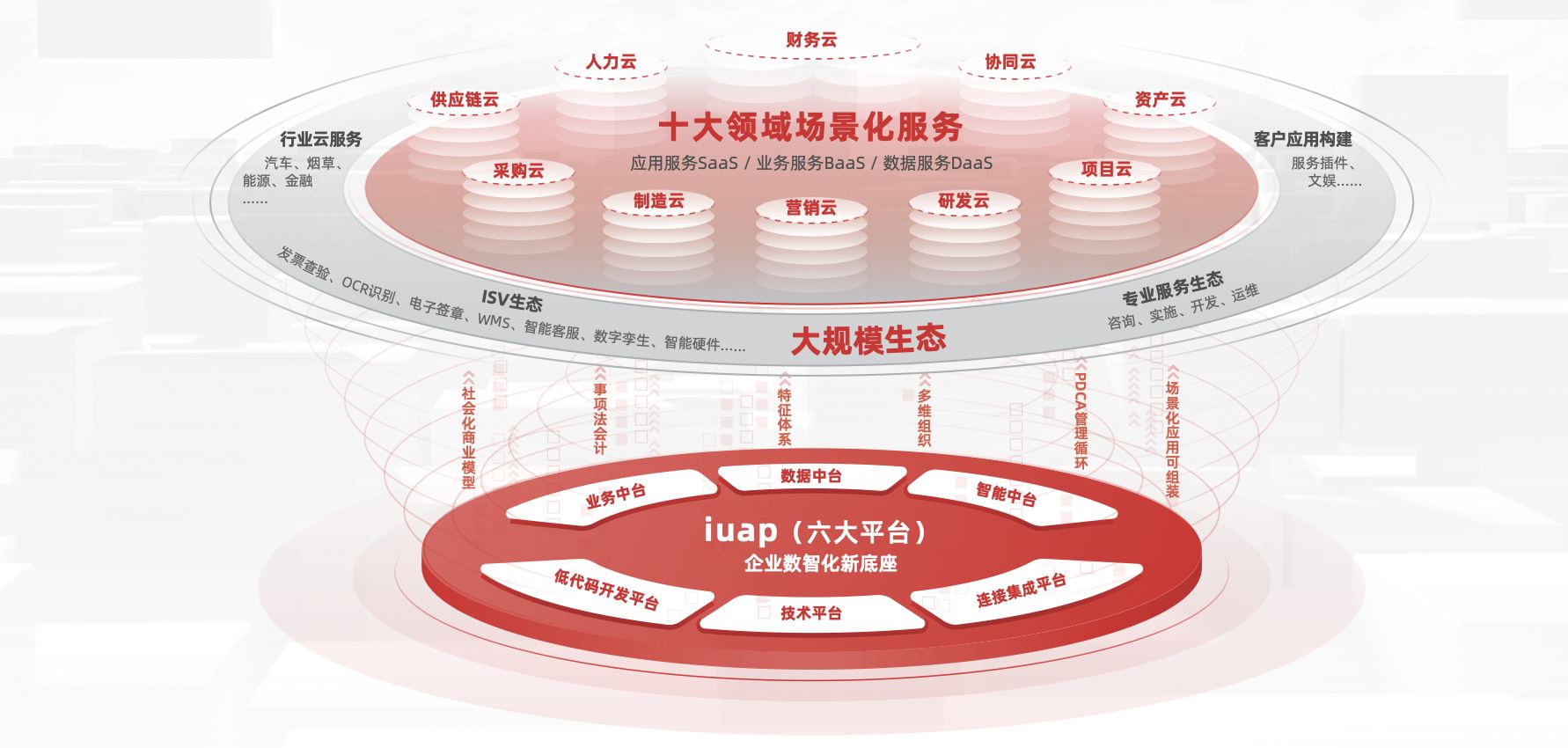 YonBIP设计和实现了云原生、元数据驱动、中台化、数用分离的新一代技术架构,将各种数智化技术与创新需求融合,让商业创新更便捷;同时基于社会化商业、事项法会计、特征体系、多维组织等应用架构,支持社会级数字化建模,支撑财务、人力、供应链等领域构建更精细多维、弹性扩展的业务场景。