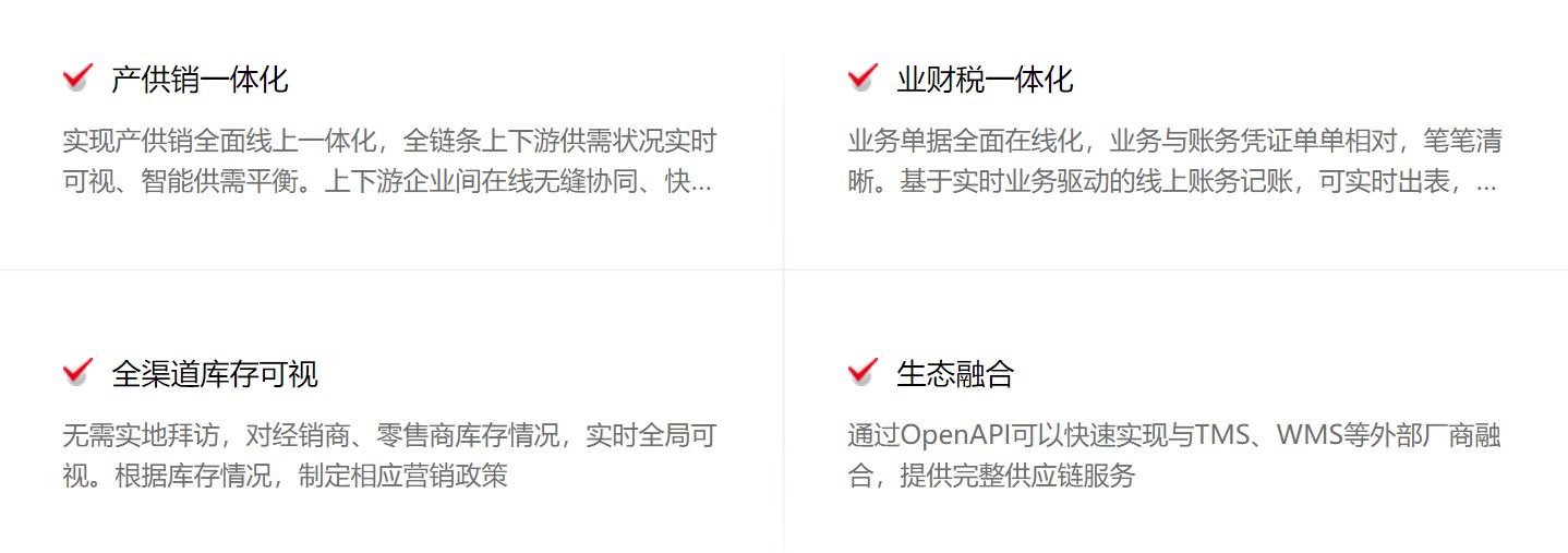 YonBIP供应链云将采购、生产、销售、库存、服务等活动紧密衔接在一起,提供完整供应链服务, 实现企业内部产供销、业财税一体化。通过社会化协同,将上游与下游企业涉及的供应商、生产商、 分销商等企业间的商流、物流、信息流、资金流形成一体化运作。通过开放的生态融合服务,为企业提供更完善的供应链服务,从而不断提升企业供应链管理水平,实现敏捷供应、高效协同。