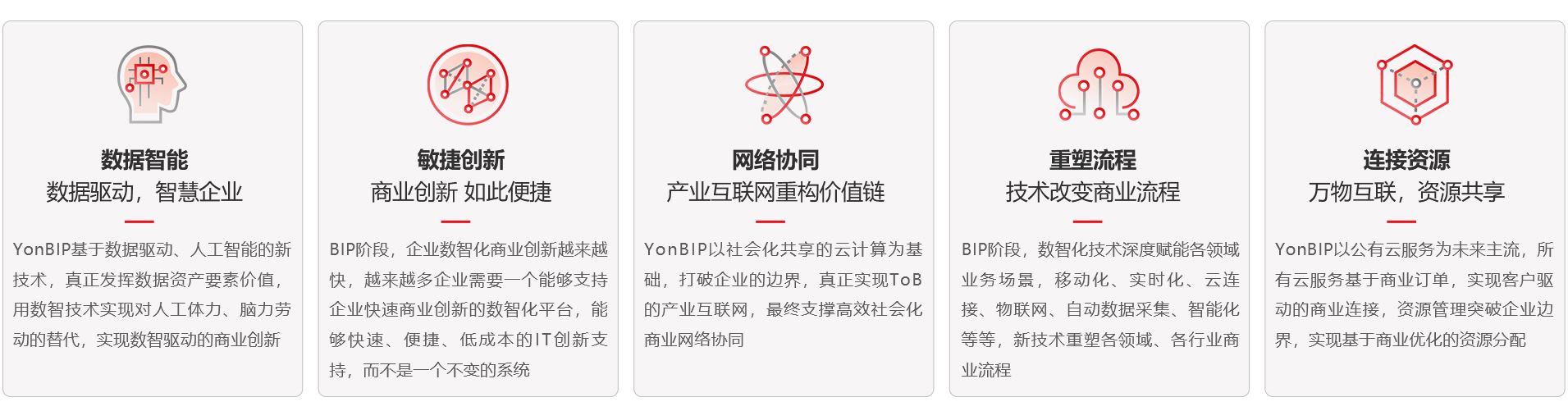 用友商业创新平台 YonBIP (Yonyou Business Innovation Platform),是用友采用新一代信息技术,按照云原生、元数据驱动、中台化和数用分离的架构设计, 涵盖平台服务、应用服务、业务服务与数据服务等形态,集工具、能力和资源服务为一体,服务企业与产业商业创新的平台型、生态化的云服务群。