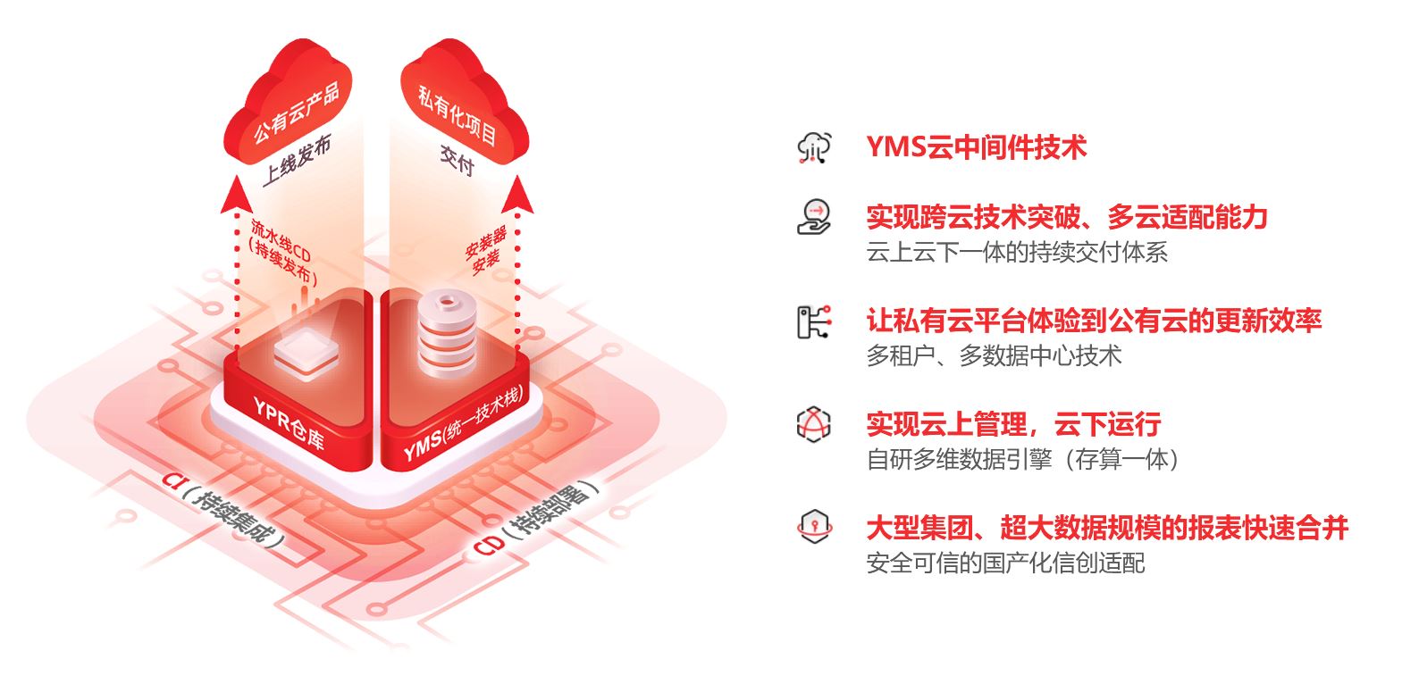 YonBIP 创新领先云技术,其技术底座iuap作为全PaaS能力一体化平台,坚持公有云优先,采用微服务架构开发运维一体化,基于YKS容器云、YMS云中间件技术实现跨云技术突破、多云适配能力,以及云上云下一套代码、一体化交 付,更好地满足大型企业需求 。