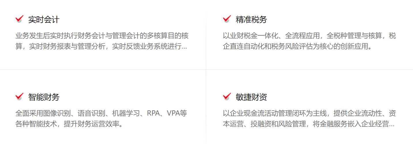 YonBIP财务云采用大智物移云的技术,基于事项法会计理论,以业务事项为基础,实时会计、智能财务、精准税务、敏捷财资为核心理念,构建财务会计、管理会计、税务服务、报账服务、财资服务、企业绩效、电子档案服务、共享服务的全新一代财务体系,打造具备实时、智能、精细、多维、可视、生态的全球领先企业数智化财务云服务平台,助力企业财务数字化转型。