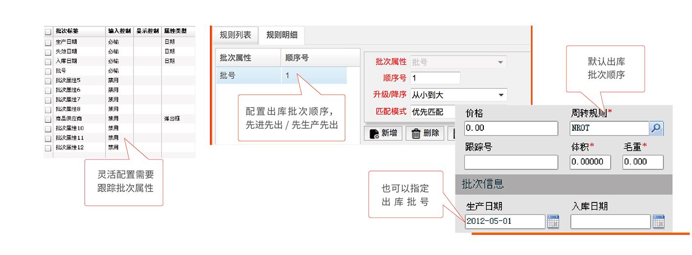 • 支持自定义出货时的批次规则,如 FIFO、FEFO、FMFO,也可以与包装属性和库位规则组合多个属性确定出货批次顺序: