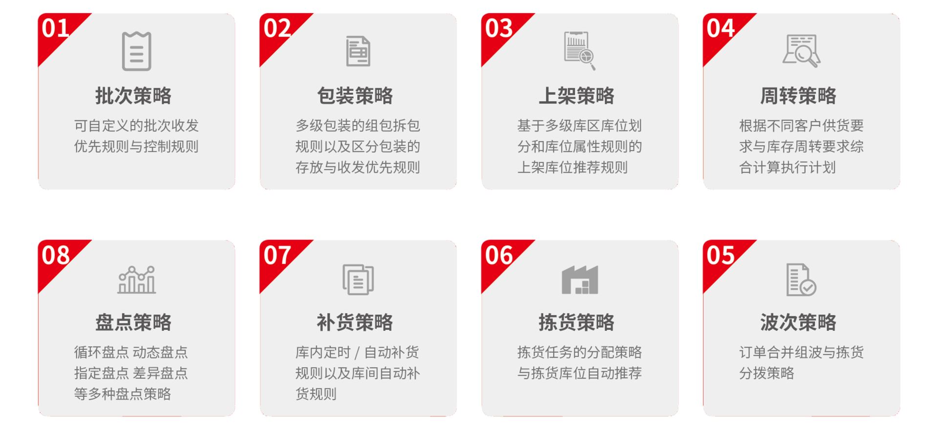 • 预配策略 / 分配策略:按批次进行库存锁定,按包装级别进行库存预配,拣选库位分配和存储库位分配;