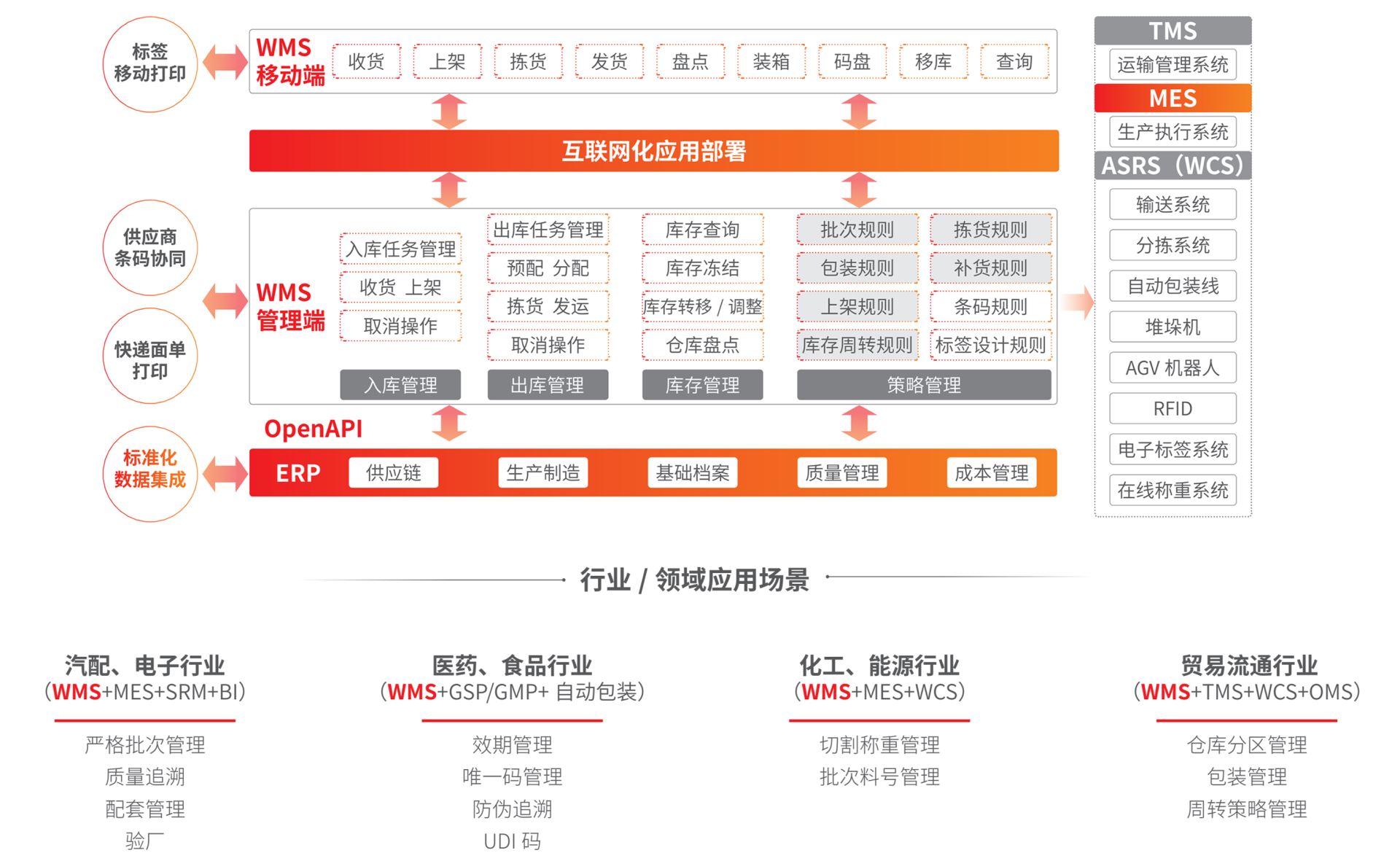 智能仓储是智能制造的重要构成环节,为物料供需的执行和管控提供合理的保障。WMS基于实物的数字化标识(条码标签/电子标签)和仓库的数字管理,将ERP的供需计划与管控要求细化并落实到实物操作过程,提高执行效率和精准度,同时也作为其他业务执行系统(如MES、TMS)和自动化立库(ASRS)的控制枢纽和数据跟踪平台。