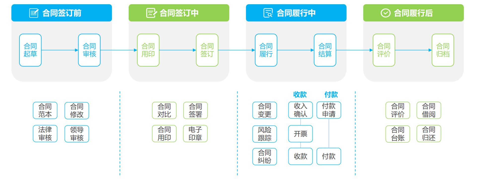 再到合同评价和合同归档的“签订前-签订中-履行中-履行后”全过程