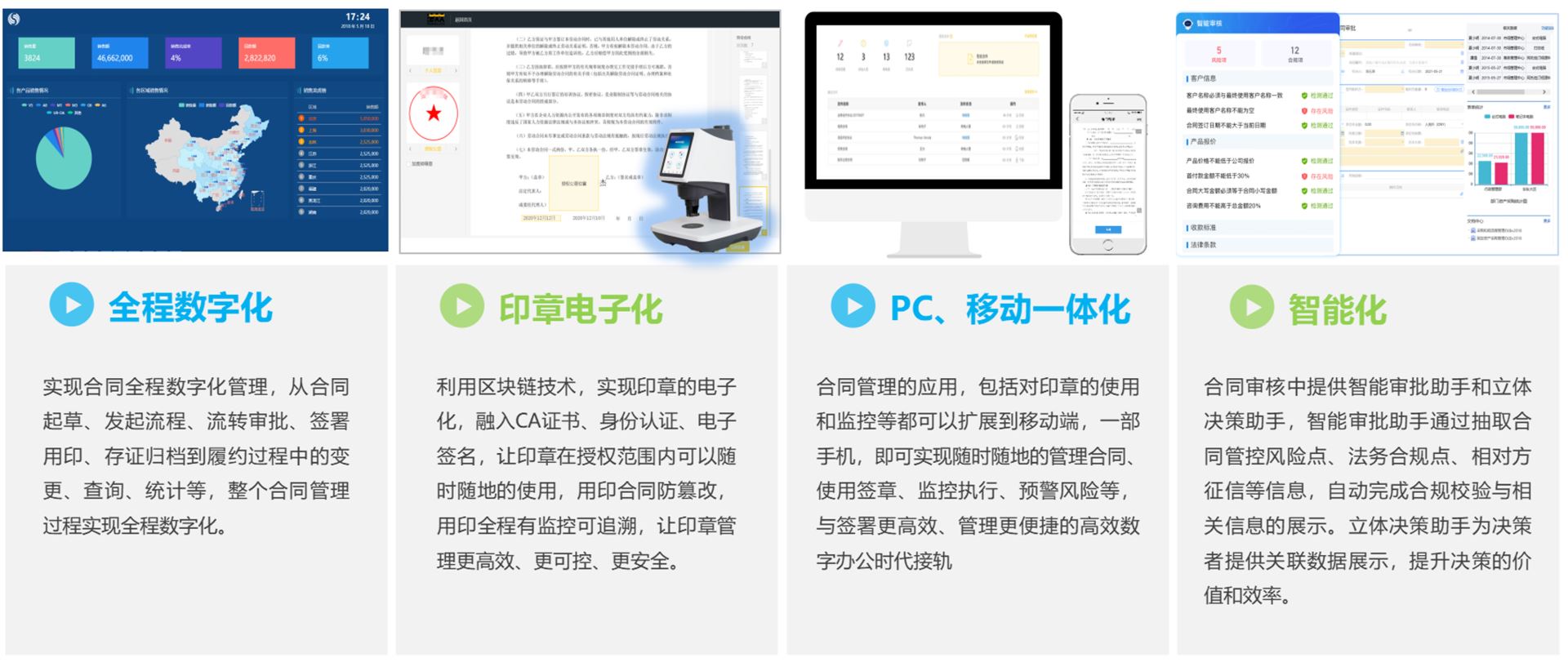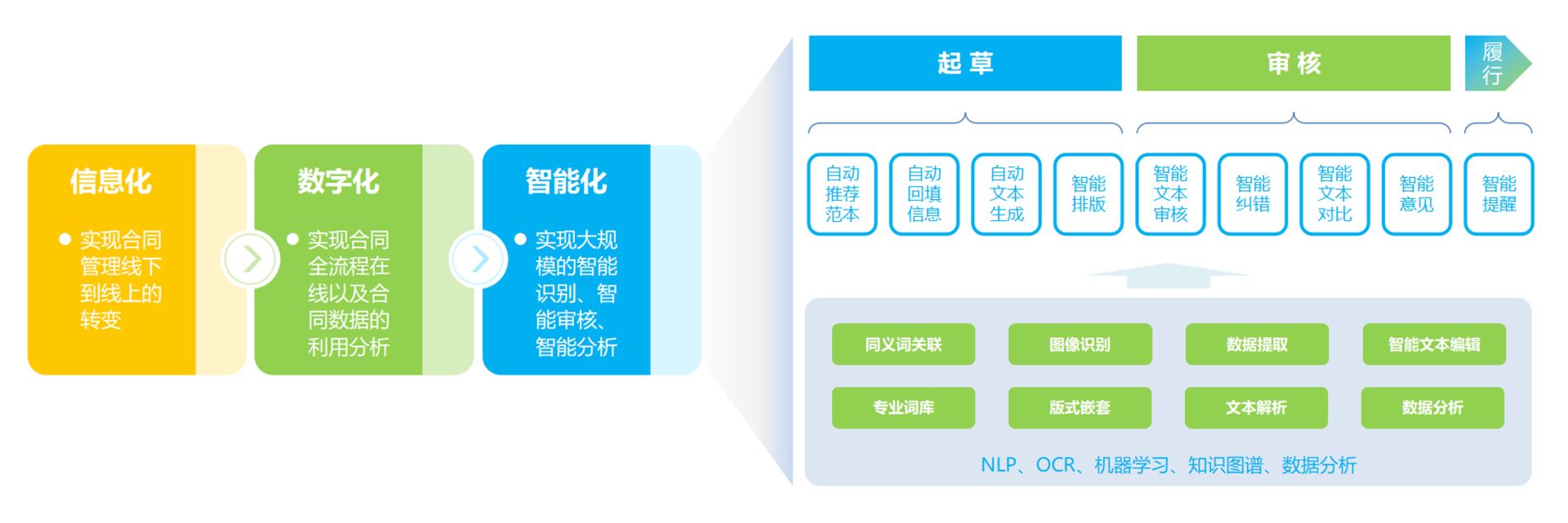 致远合同管理系统利用智能化技术促进管理水平提升根据底层支撑技术发挥作用的阶段性差异,电子合同管理经历“信息化 – 数字化 – 智能化”三大阶段。目前,智能化电子合同管理建立在合同数据化的基础上,借助人工智能、大数据等技术,实现企业合同数据的数字化、资产化,为企业运营提供决策数据参考。