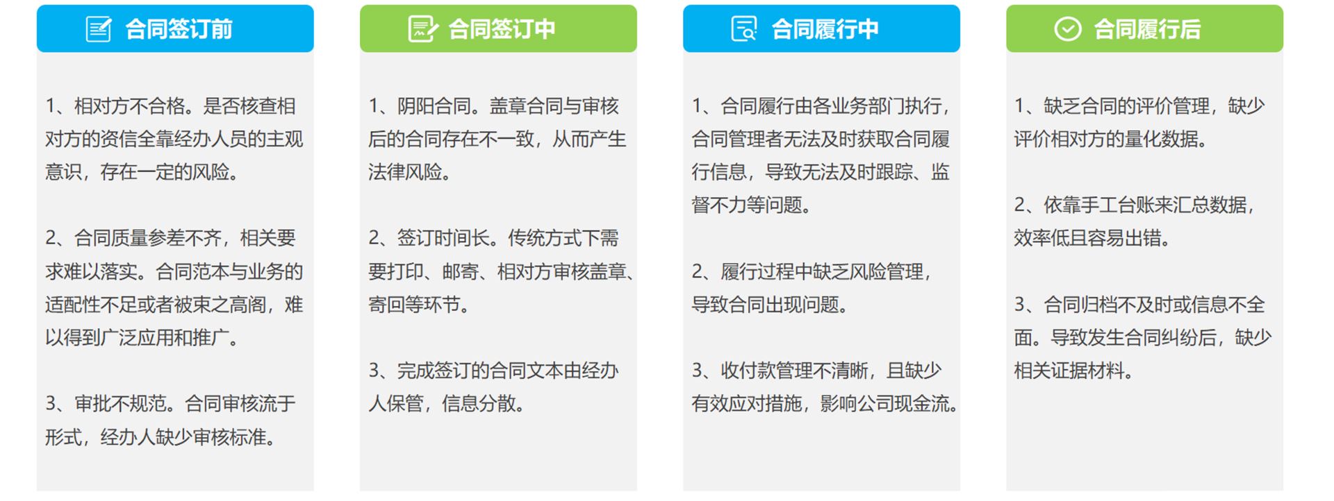 企业的合同管理在“签订前-签订中-履行中-履行后”的过程中面临一些列的问题,例如相对方不合格、审批不规范、履行跟踪难、归档不全面等,是的企业的经营活动存在风险。
