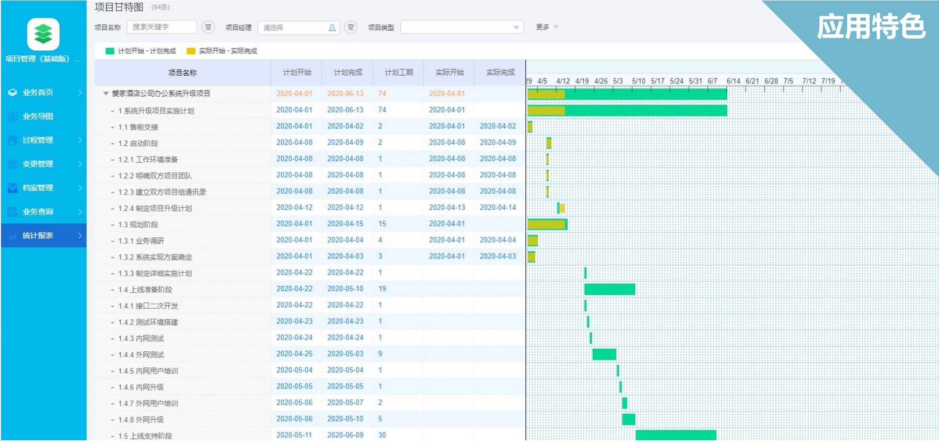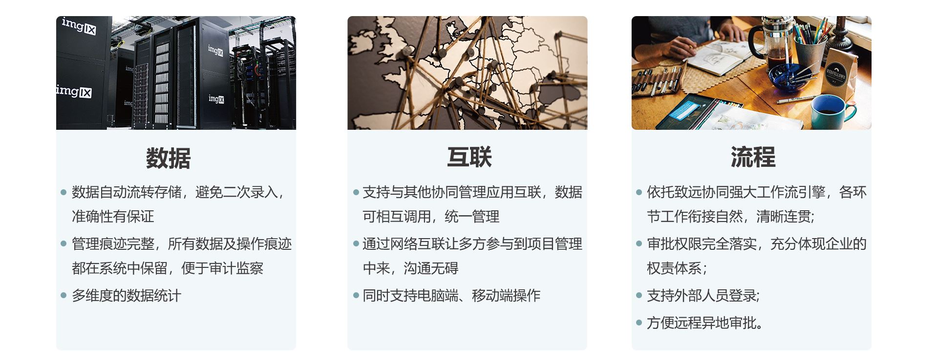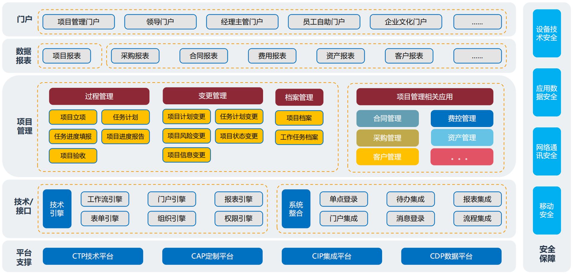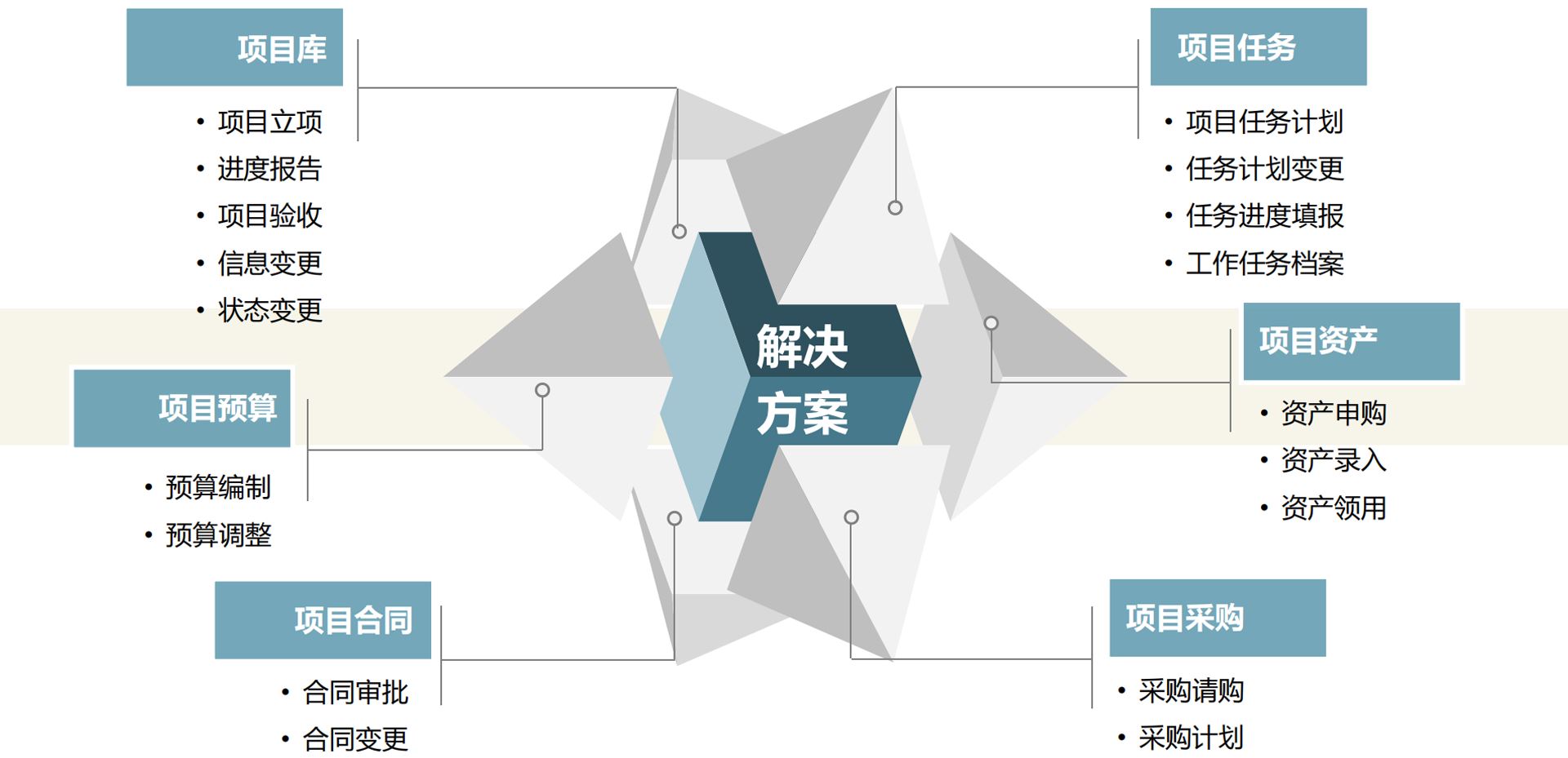 以项目为中心,从项目立项、工作任务分解、进度计划、进度填报到项目验收的项 目过程、项目档案以及计划、状态、风险、信息的变更管理。 通过对项目信息、风险、进度、文档等管理,加强项目过程跟踪与控制,有效地管 理启动、规划、执行、监控和收尾过程,加强计划、执行和变更的管控从而保障项 目成功,提升企业战略执行力。 汇集合同管理、费用管理、资产管理和采购管理应用中与项目有关的管理内容及报 表数据,使单位、企业可以从项目管理的维度处理相关事务,分析业务数据信息。相关事务,分析业务数据信息。