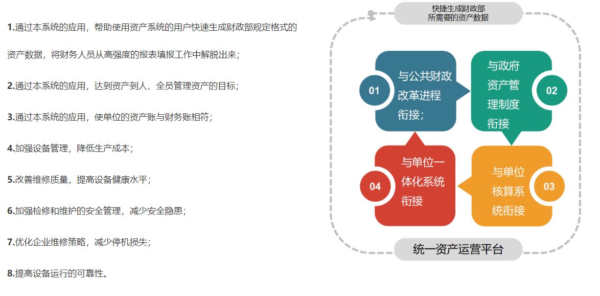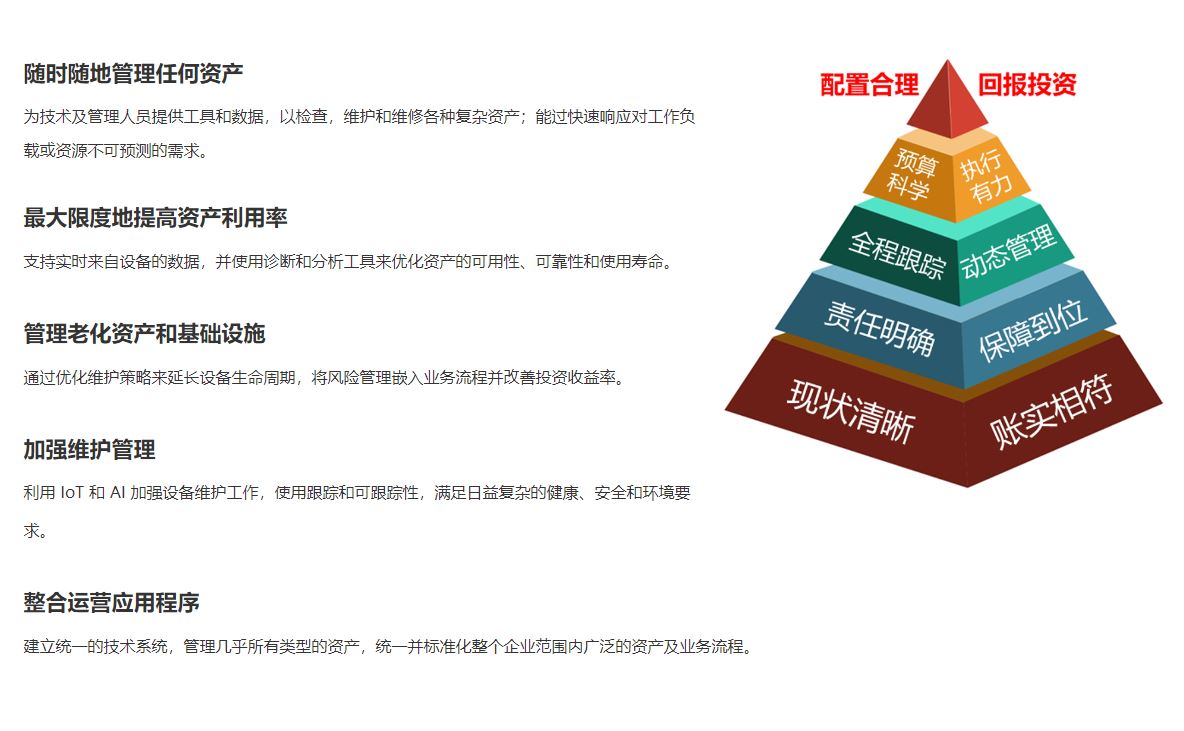 覆盖资产运用的全生命周期管理,以提高企业资产运营运行可靠性与使用价值,降低资产的养护维修成本、提升运行质量,提升企业资产运营效能