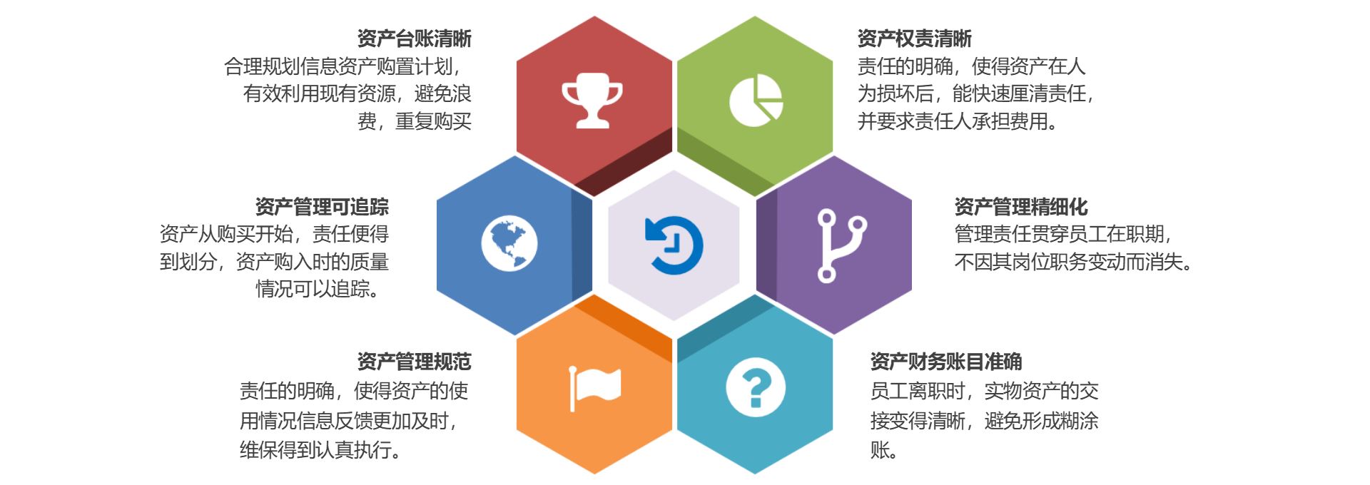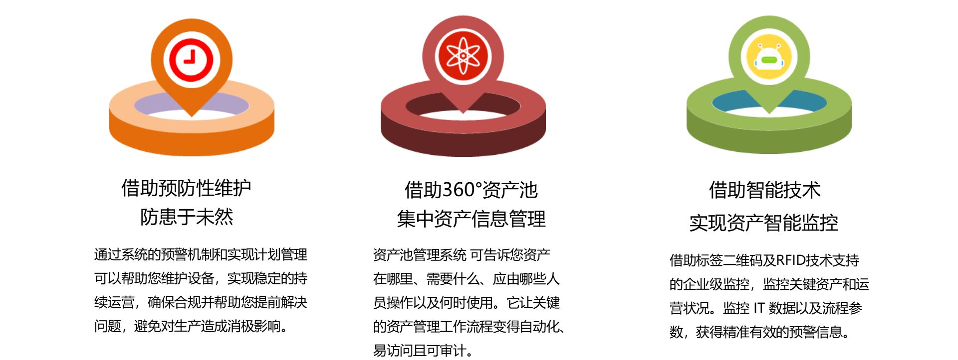 管理层:以资产全生命周期管理为目标,跟踪资产变动、存储和分布情况,实现资产设备从采购、安装、调试、运行状态监控、维护保养、移动、退役的全生命周期的规范化、精细化管理,全面提高资产利用率,降低资产运营成本,使设备资产效益较大化。
